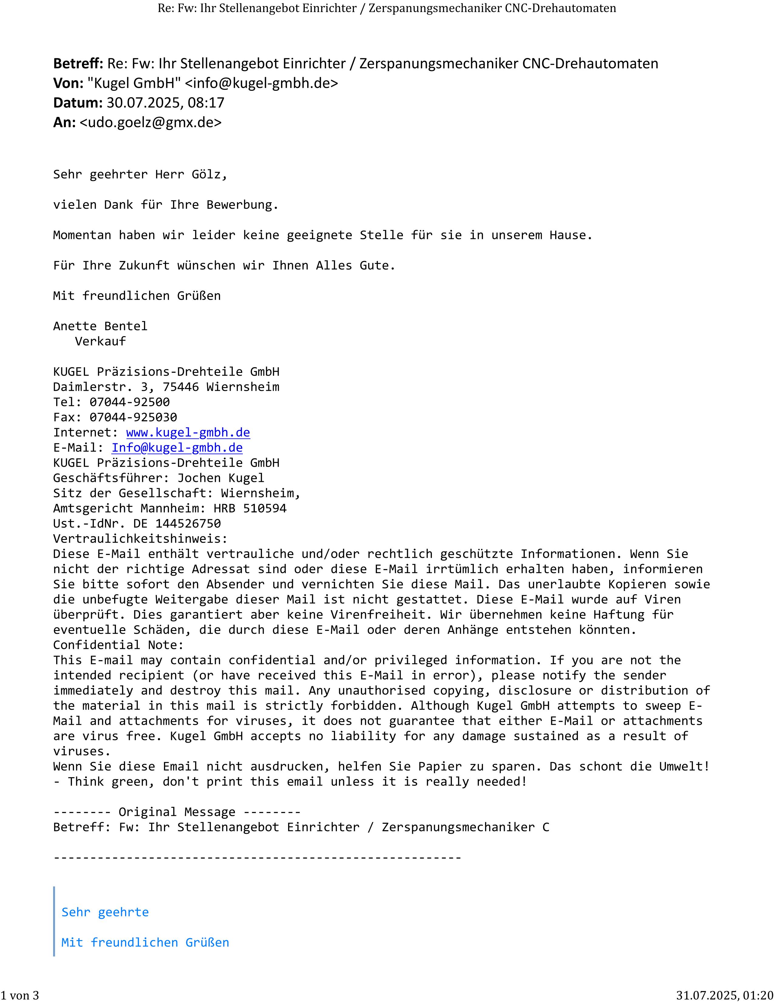 Absage zur Bewerbung vom 27.7.25