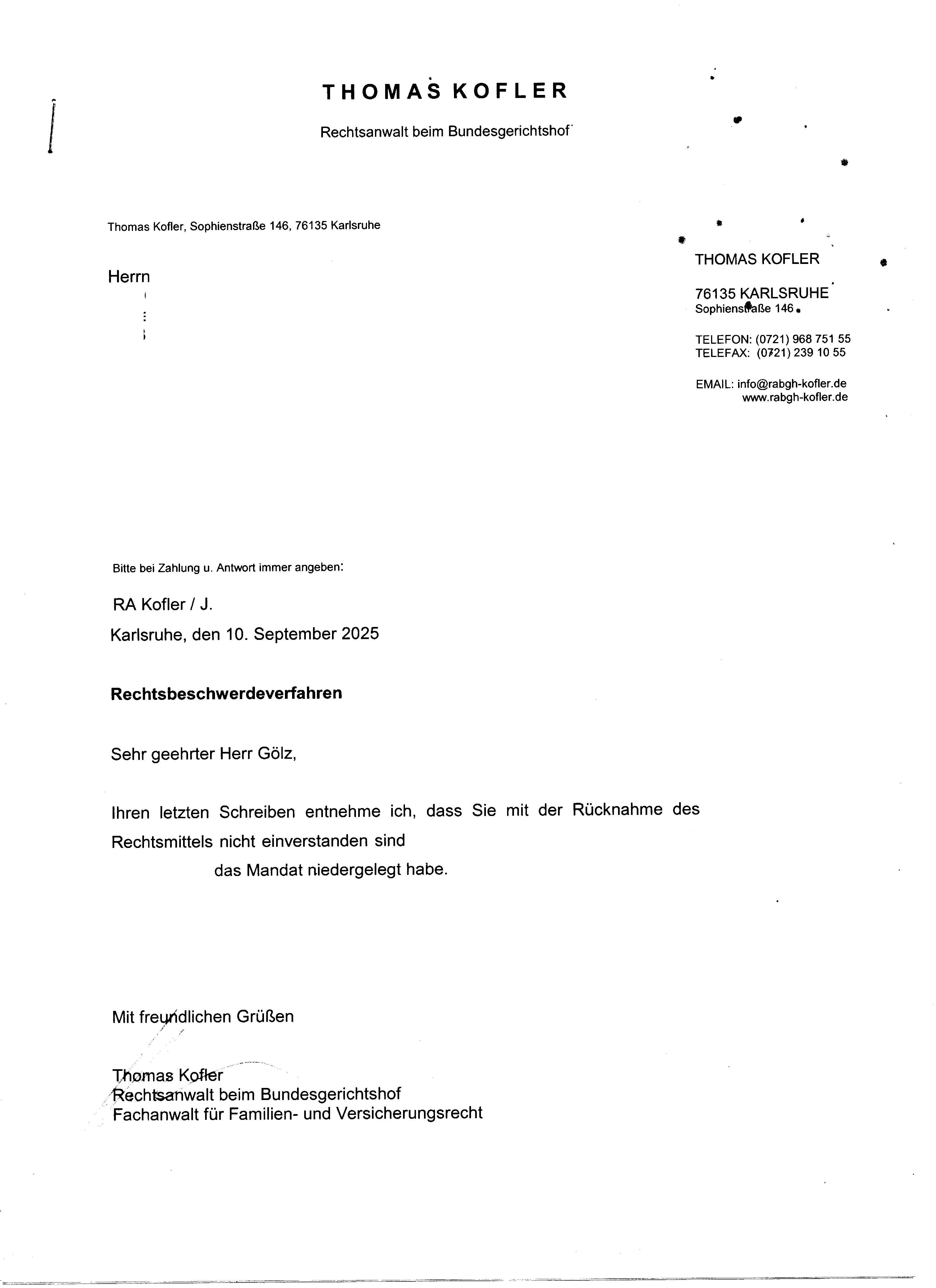 Mordfall Jürgen Gerstner - Schreiben an Kanzlei, nach abwegiger Rückfrage