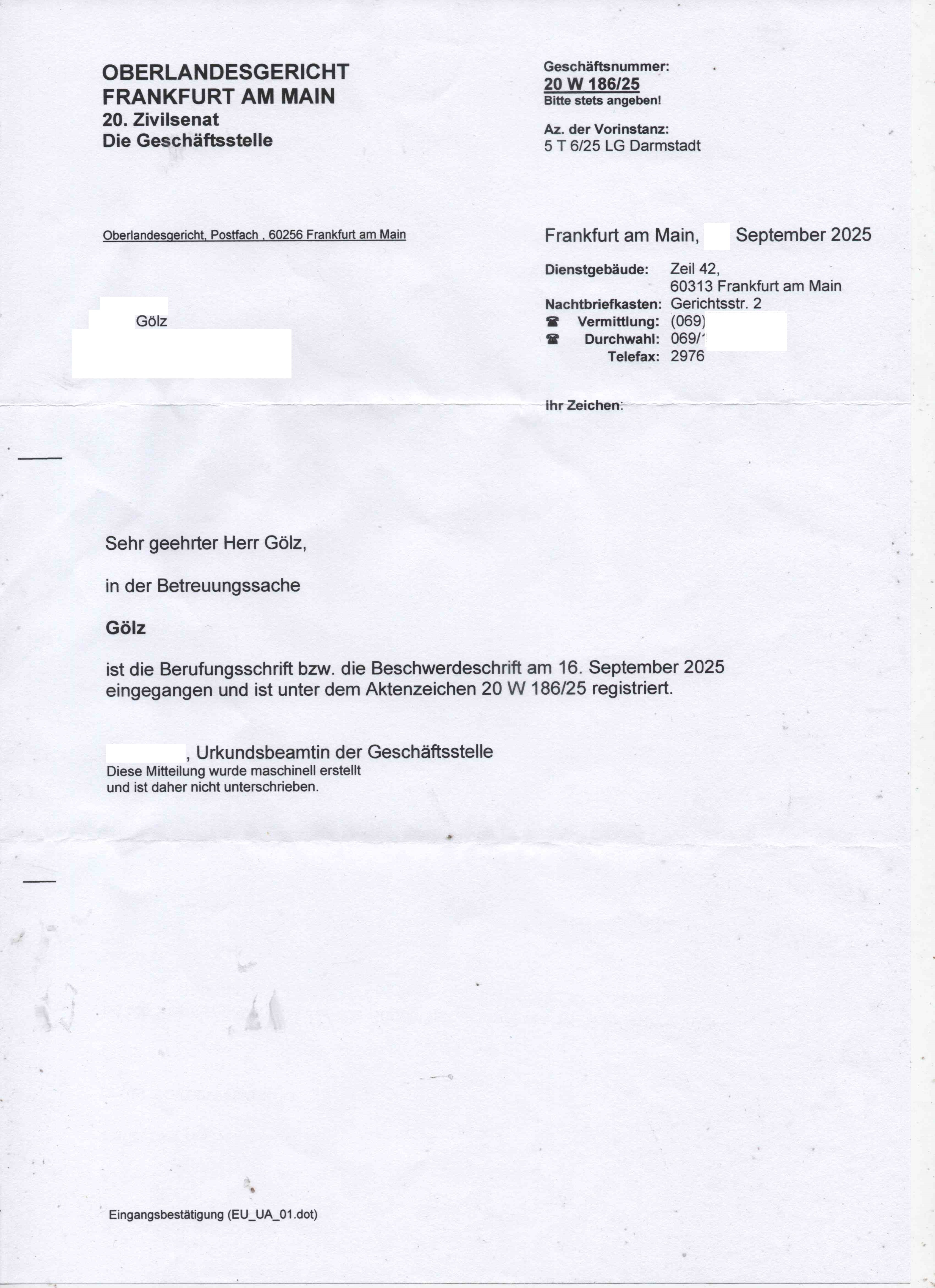 Mordfall Jürgen Gerstner - Beschwerde und Berufung gegen das rechtswidrige Betreuungsverfahren bzw. das unsachgemäße/rechtswidrige Vorgehen auch des Landgerichts Darmstadt ist vom OLG Frankfurt Main angenommen worden