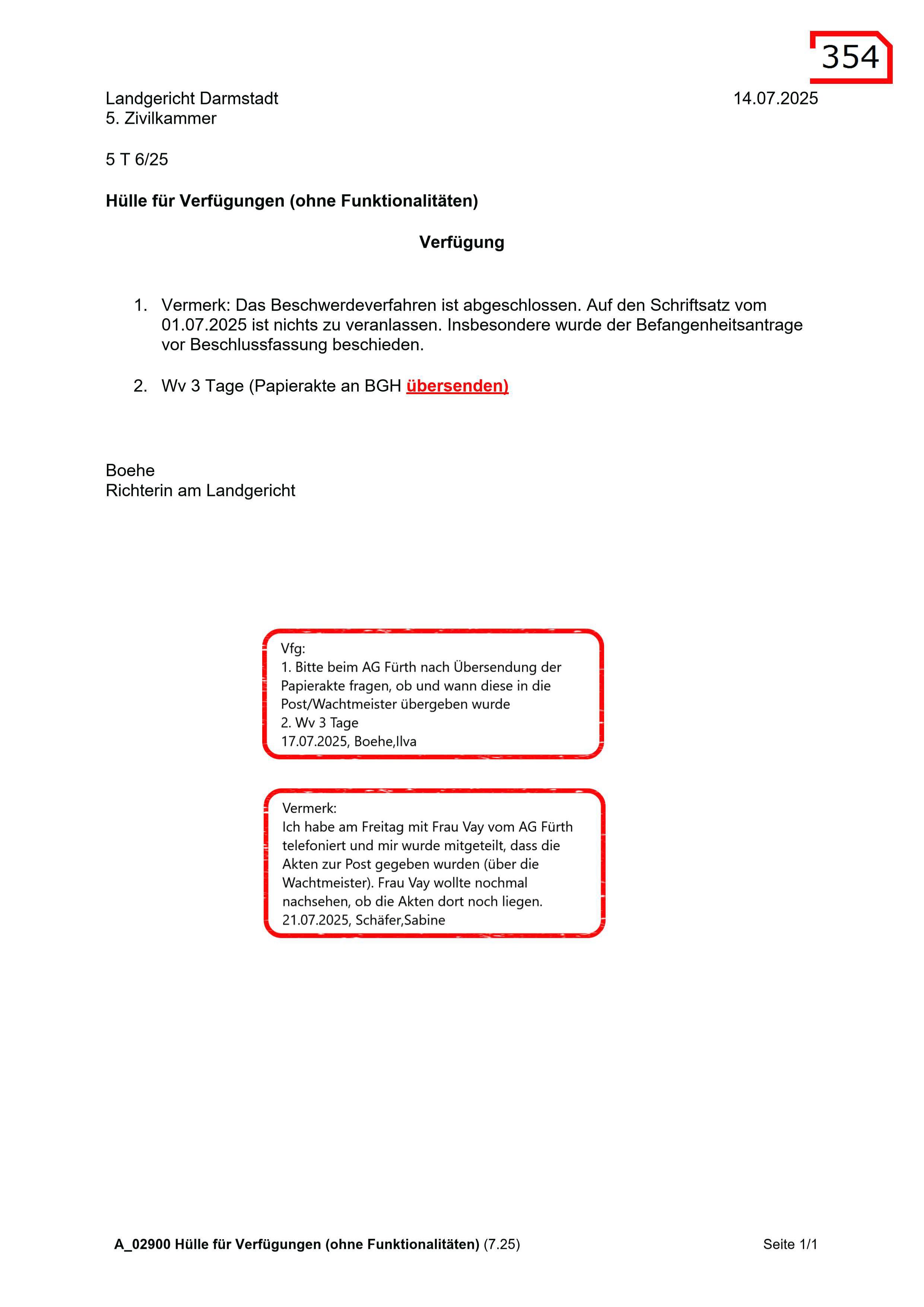 Hrn. Richter Unger, Fr. richterin Boehe und Fr. Richterin Nesra sowie alle weiteren Verfahrensbeteiligten beim Langericht DA das Aktenzeichen 5 T 6/25 und alle weitere nVerfahre nbetreffend, die von seitens des landgerichst nie bearbeitet worde nsind.