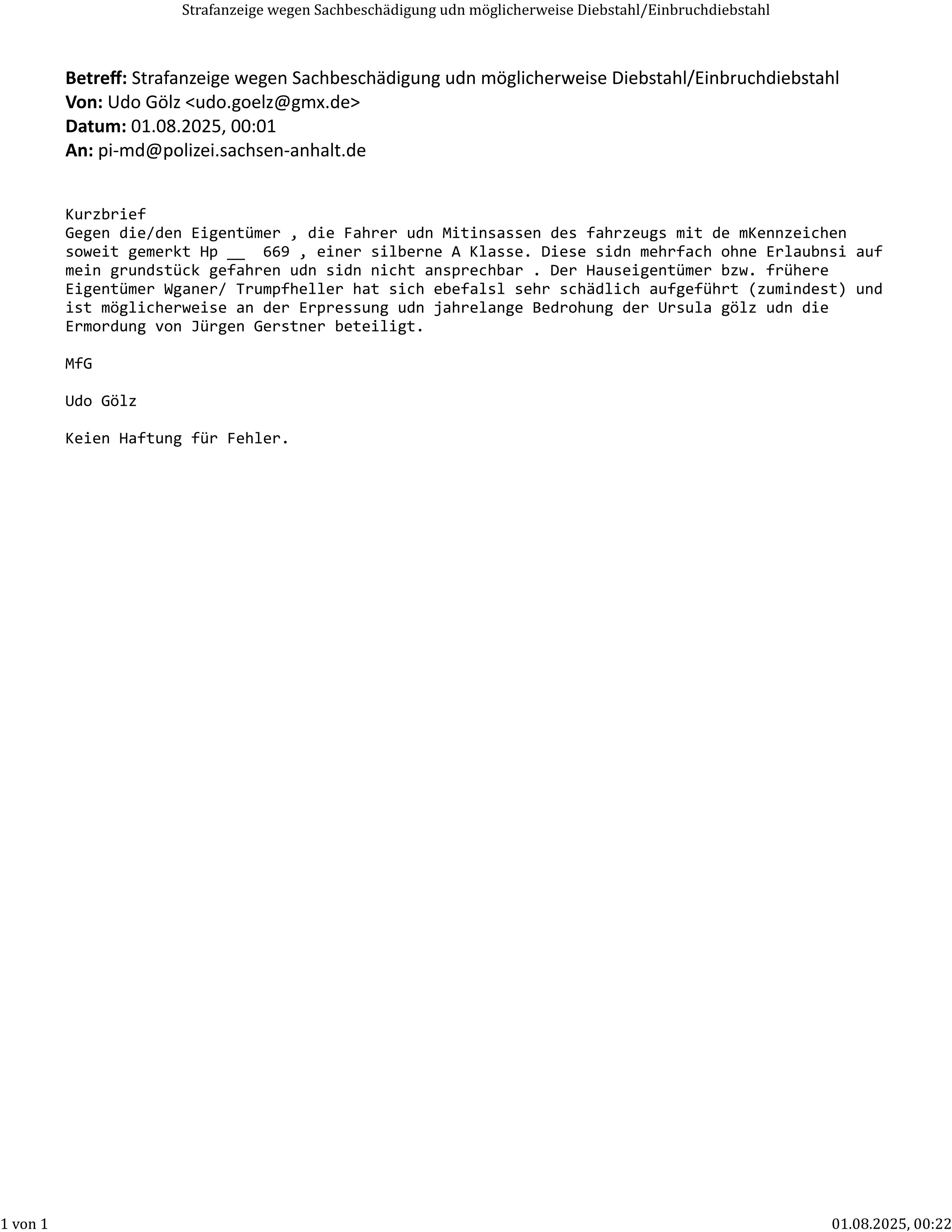Mordfall Jürgen Gerstner - Strafanzeige wegen des Verdachts auf Sachbeschädigungen und weiteres in Gadern gegen Den Halter7Fahrer der helle nA-Klasse Mit HP __ 669