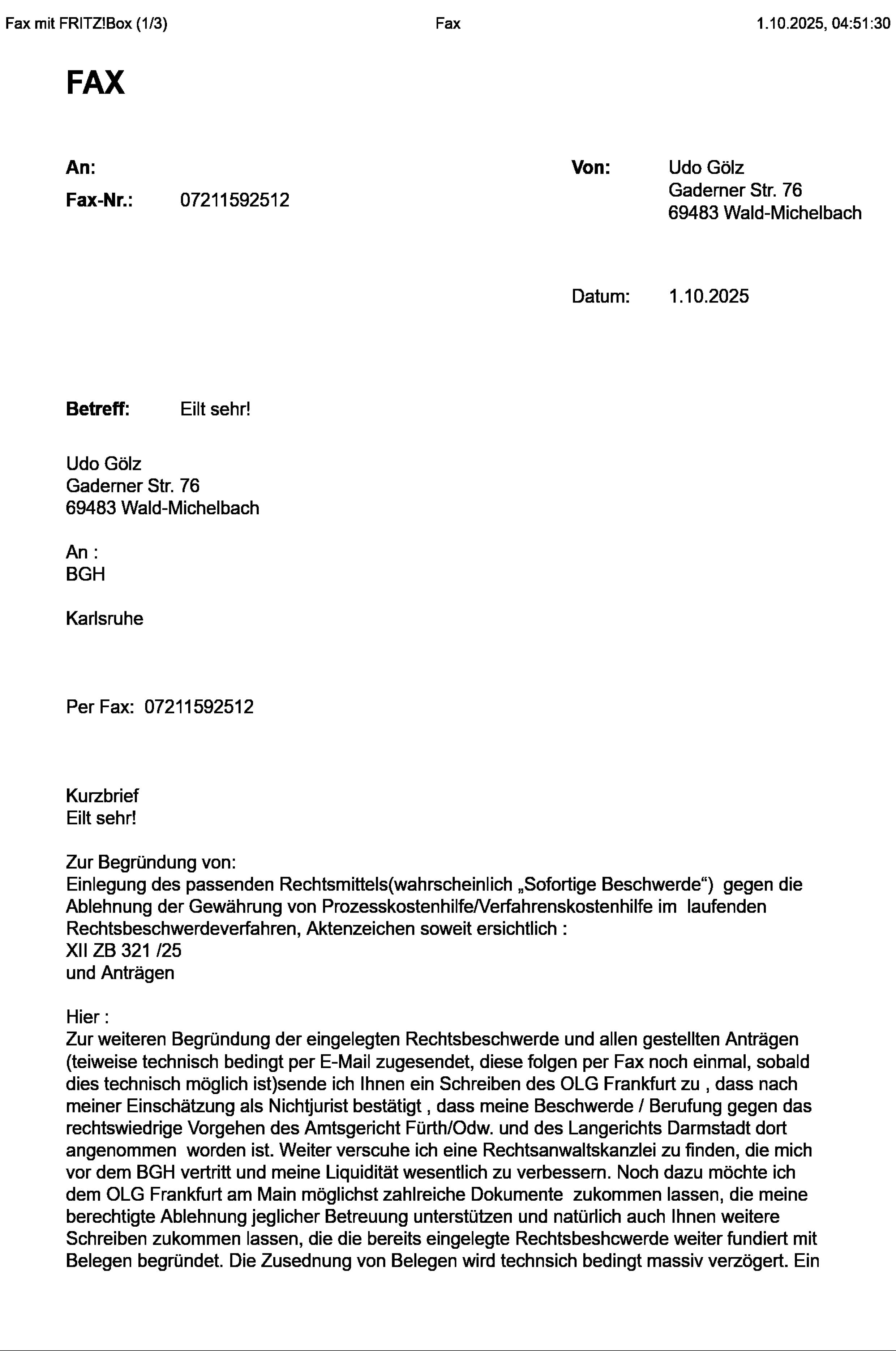 Mordfall Jürgen Gerstner - Erzwungene zweifache Korrekturzusendung(Fehler durch EDV Technik, da ich tatsächlich ledig bin und alleine wohne, dann Fehler 1und1) an de nBGH, da die Übertragung durch 1und1 bei m ersten Versuch wie oft nicht funktioniert hat