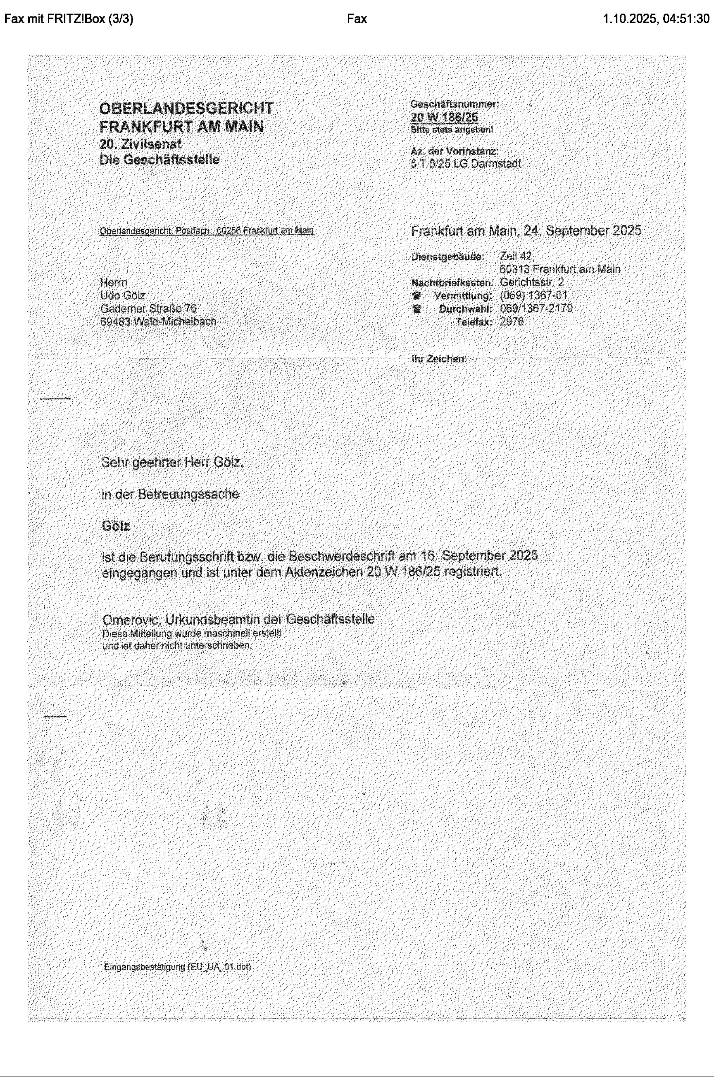 Mordfall Jürgen Gerstner - Beschwerde und Berufung gegen das rechtswidrige Betreuungsverfahren bzw. das unsachgemäße/rechtswidrige Vorgehen auch des Landgerichts Darmstadt ist vom OLG Frankfurt Main angenommen worden