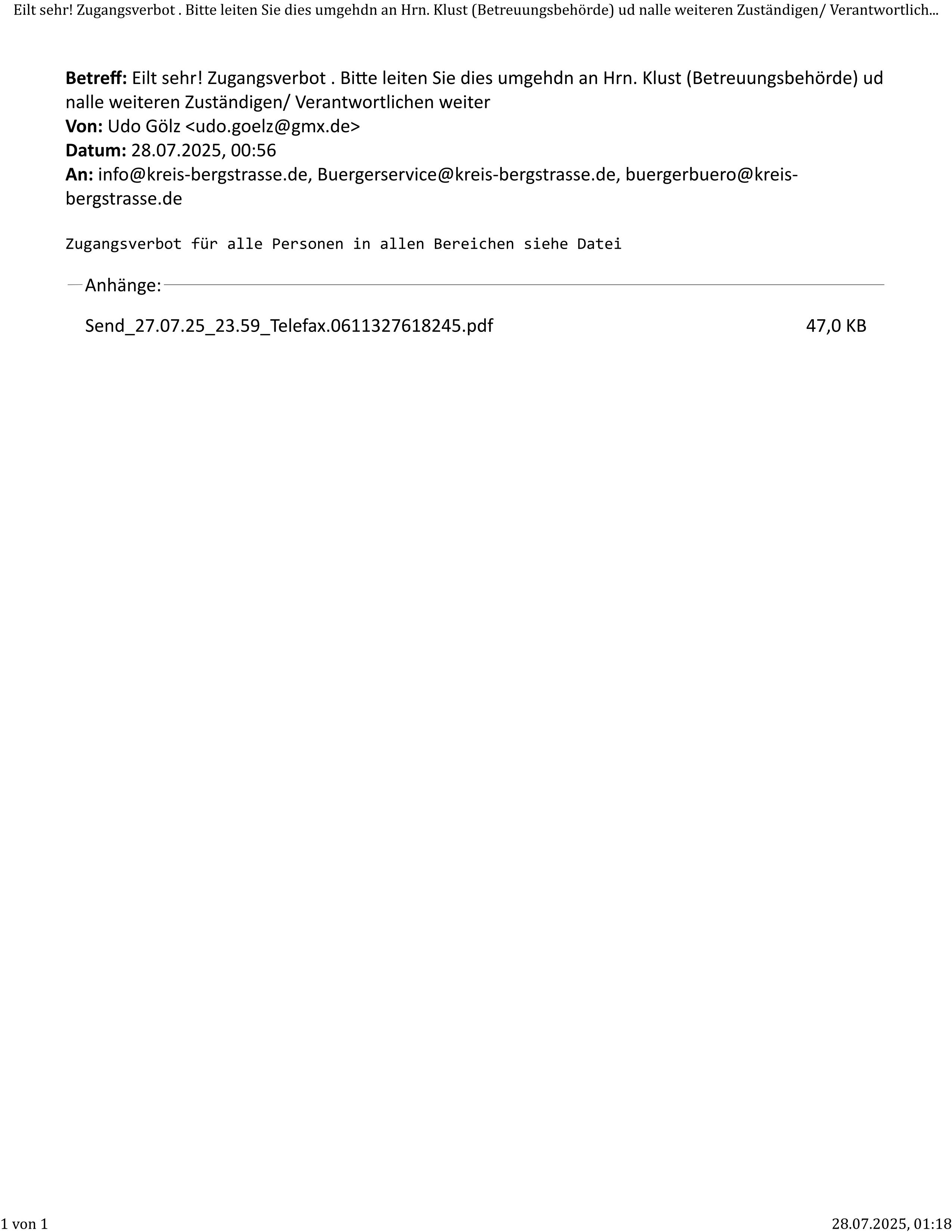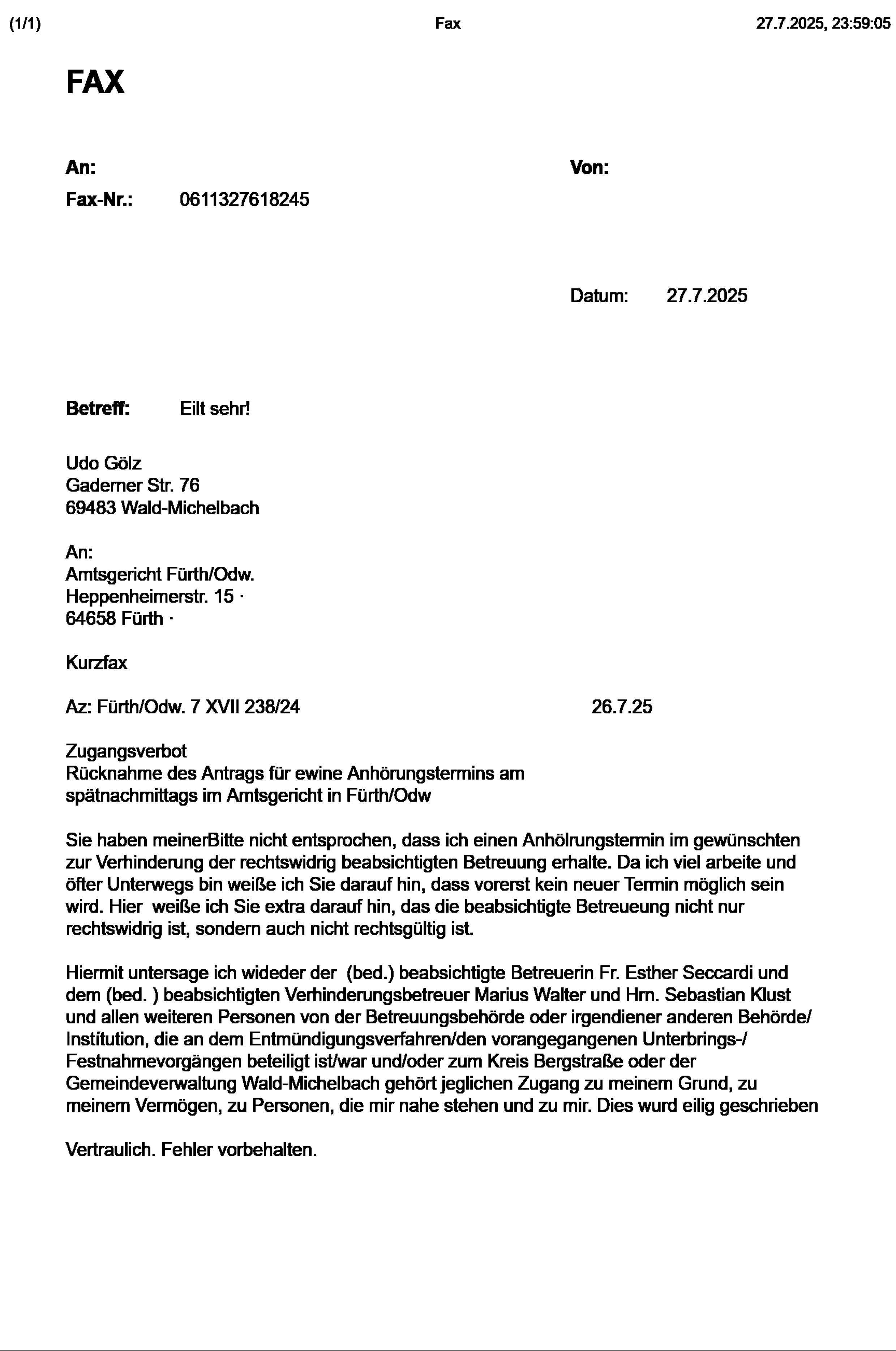 Neuerliches Zugangsverbot für alle Beteiligten: Amtsgericht Fürth/Odw. verweigert rechtswidrig Anhörungstermin, der dazu dienen sollte , dass das rechtswidrige Entmündigungsverfahren beendet wird und jede Betreuungsabsicht zurück genommen wird